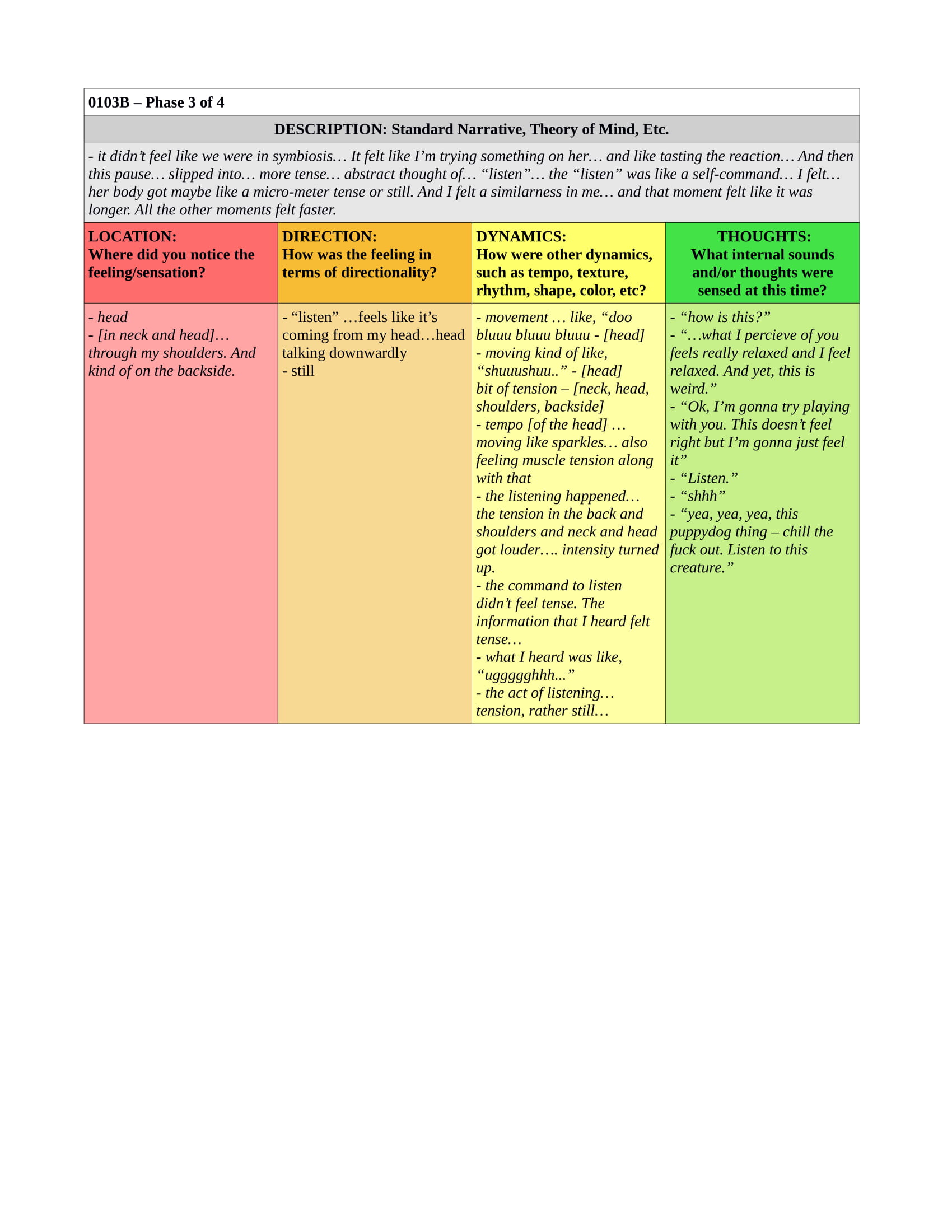 In relation to trauma research: the similarity of sensation-description during low stake and high stake situations have me guess that it’s a good place to research – I suspect that low stake research can shed light on human experience in places where a controlled study of high stake (aka trauma research) is not possible. I chose to investigate “awkwardness, confusion, or “not quite right-ness during interaction” for a particular reason, in part, because I had been noticing my own affective responses during low-key (ie little/zero career risk, social risk, physical risk, long-term/deep emotional risk, etc) moments of improvisation/daily life. During such moments I often noticed “tightening/closing in” sensations and/or “frozen” sensations. This experience seems to be echoed in all participants interviewed (as well as in prior interviews).