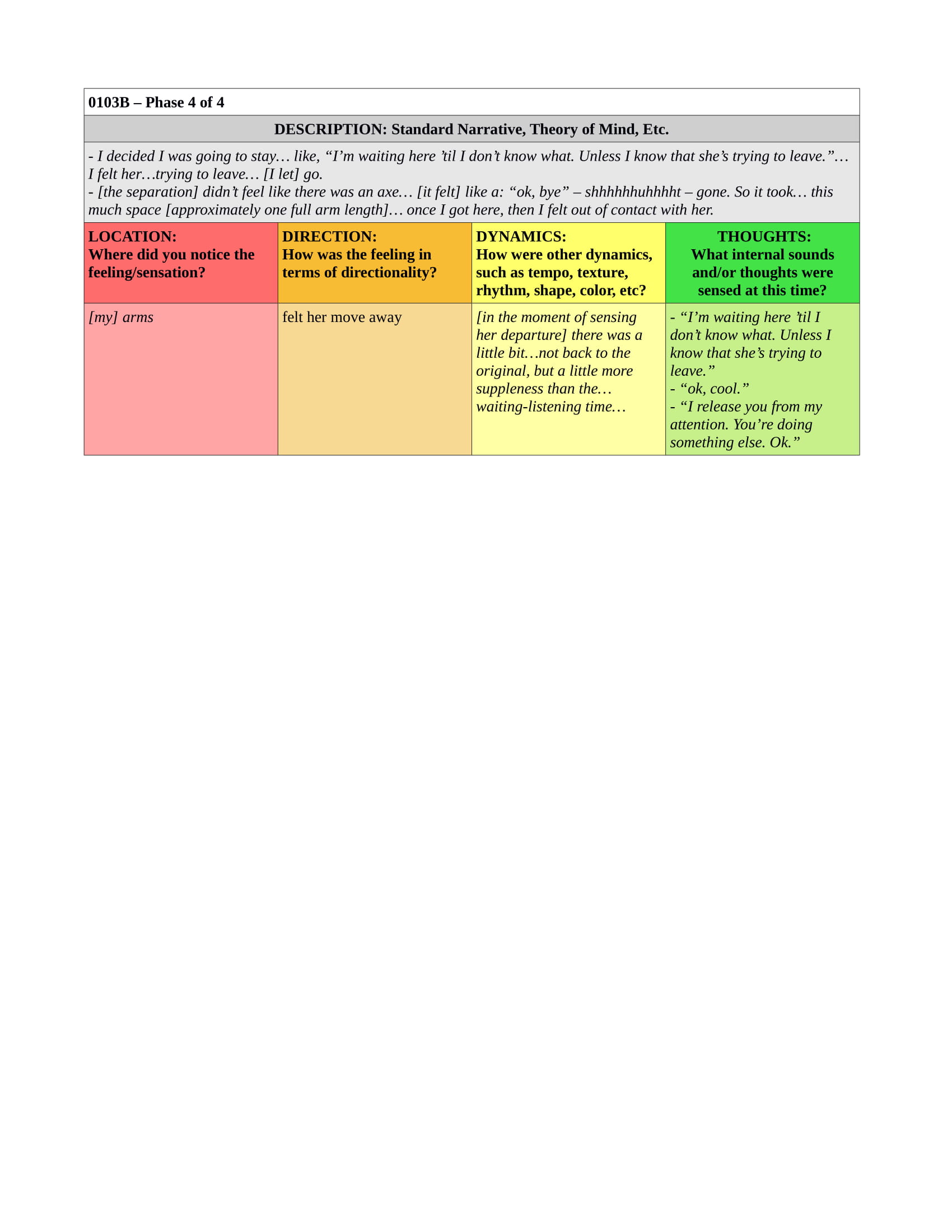 These charts are based on one moment of an interaction between participants 0103A + 0103B. Scroll down to follow the phases chronologically. (More about Sensation-based interviews. More about this research.)