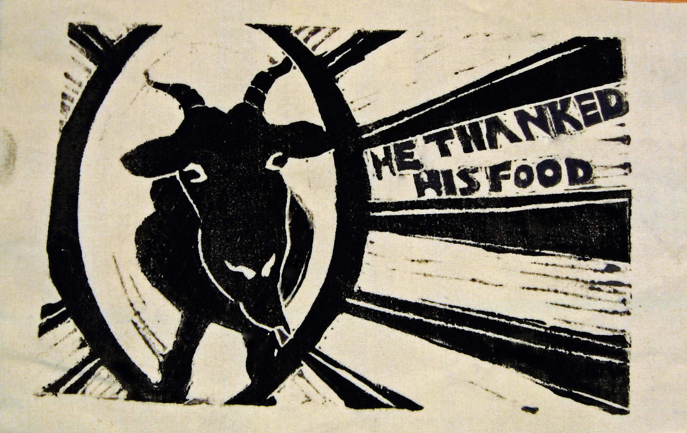 Previous Image Next Image 2013. Thanked Food. Linocut. Linoleum Print. 6″x4″. Sliding Scale $4-8. Available in black, red or turquoise-blue ink. Also, available on paper or fabric patch. Like Loading...